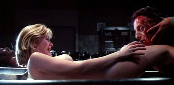 Of course, for the full viewing pleasure one must make sure to get the unrated version which, although missing the "never-before-seen dream sequence" supposedly found on the LaserDisc version, does offer many a sight missing in the R-rated version (we're talking a difference of 100 minutes to 86 minutes). The missing minutes include everything from eyeballs popping out of a head in the opening scene to a visually pleasant nude scene of one truly hot-bodied Barbara Crampton (as Megan Halsey) getting dressed after an evening roll in the hay with her boyfriend Dan Cain (Bruce Abbott) to extended shots of a fake-looking, revived but vivisected cat hissing and growling to the initial death of Dean Halsey (Robert Sampson) to the infamous cunnilingus scene to the bloody excesses of the big final showdown. Even cut of all this, Re-Animator remains a jaw-dropping experience, but with it, the film achieves a continuity of well-timed outrageous excess that simply leaves the viewer bowled over – and, as the finally scream reverberates over the blackened screen, nevertheless somewhat saddened despite all the adrenaline the movie instigates in its viewers.
