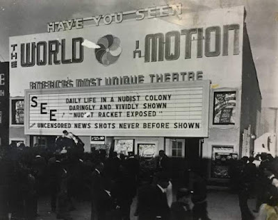 Needless to say, most if not all such films were of sexploitation nature and made less to help the cause than to show naked people bounce around, and they were very much a staple of the road show circuit. Like this one, Expose of the Nudist Racket (incorrectly billed on the marquee in the picture below originally found at Reprobate Press as Nudist Racket Exposed), a ten-minute short lacking all directorial and writing credits produced and distributed by Hollywood Producers and Distributors. But it you don't have to be a rocket scientist to figure out who made the film: Hollywood Producers and Distributors was one of the firms founded by the great Dwain Esper (7 Oct 1894 – 18 Oct 1982) and his wife [Mollie] Hildagarde [Stadie] Esper (14 Jul 1895 – 21 Jul 1993), and Expose of the Nudist Racket also displays some obvious stylistic similarities to their exploitation product, most notably the dryly witty "square-up" (admonitory justification) that opens the film and the general tone of the voiceover. Thus, we are not going too far out on the limb to claim the unproven: Hildagarde probably wrote the film, but Dwain, a man (according to David F. Friedman) who had "balls of a life-size bronze stallion", surely directed it.